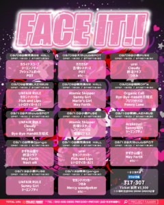 日時:2026年03月09日(月)開場:18:00/開演:18:30 3/9(月)FACE IT!! @大分clubSPOT OPEN 18:00 / START 18:30 w/古墳シスターズ / POT / etc… チケット先行〜1/18(日)23:59まで 3,500円 https://w.pia.jp/t/faceit/